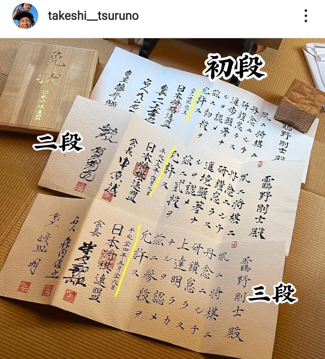つるのは「学業優先期間だったこの2年で疎かになってしまったことのひとつ、『将棋』」と記し、初段・二段・三段の免状を公開した。